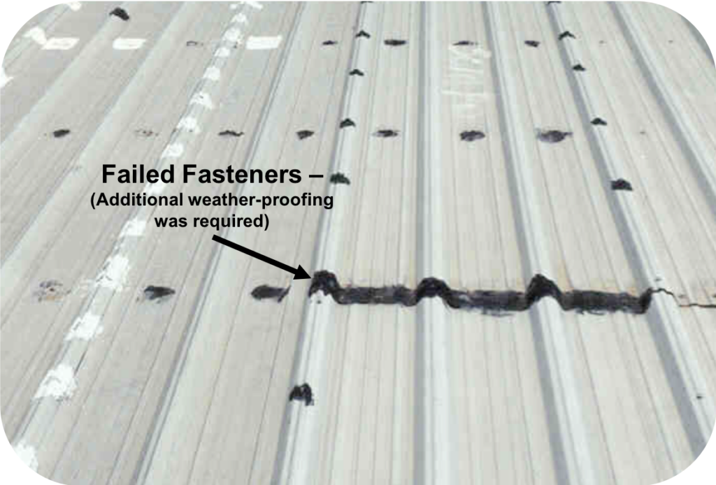 Thermal expansion and contraction, wind uplift, and long-term stress can cause fasteners to loosen, back out, or enlarge their attachment holes. This condition can allow water penetration and reduce wind resistance.